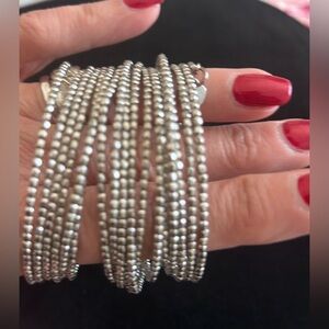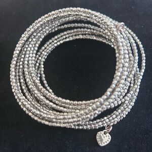 This type of bracelet, also referred to as a memory wire wrap bracelet, maintains its shape due to the internal wire structure, allowing it to coil around the wrist. The specific design seen is likely the silver bead variant, known for its versatility and ability to complement various outfits. These bracelets are designed for layering or wearing alone, making them a popular choice for everyday style.