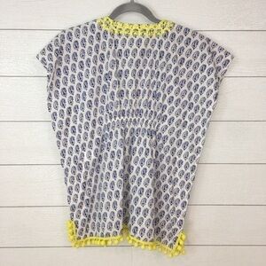 Blue paisley print on white cotton and yellow embroidery at neck line. Yellow Pom-Pom trim at lower hem. Small section of elastic below bust. Size is S//M to fit ages 6-10 years