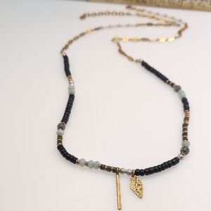 This exquisite Stella & Dot necklace showcases a minimalist design with alternating black and gold beads on a delicate chain. The gold-toned chain is adorned with a charming gold feather pendant, adding a touch of elegance to any ensemble. Perfect for both casual and formal occasions, this necklace is a versatile addition to your jewelry collection.