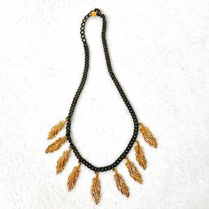 Stella and Dot necklace with a black flat curb chain with gold tone feathers/leaves dangling. Can be casual or great with a suit. Great contrast with the colors. In very good overall condition. The finish on the chain and dangles is very good. No loss of color or signs of wear. Chain length is approx. 15.5 inches plus there is an additional 1.75" extender chain, for a total of 17.25 inches. The dangles are about 1.25" and the design is on sides.