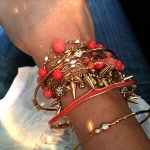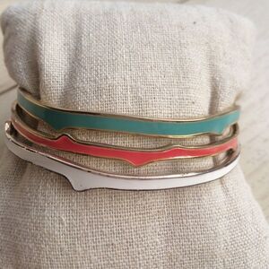 Fun and elegant enamel bangles in coral rose, light teal green, and ivory white. 🌸