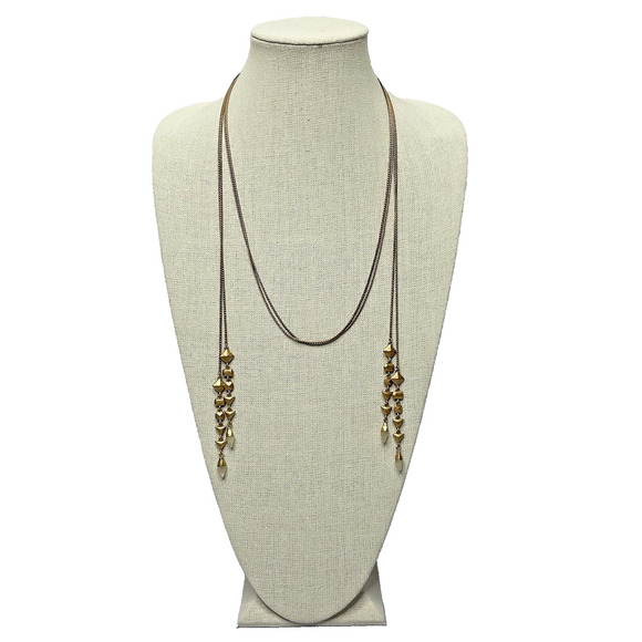 Elegant long necklace with gold accents. Features cascading gold charms. Perfect for layering or standalone wear.