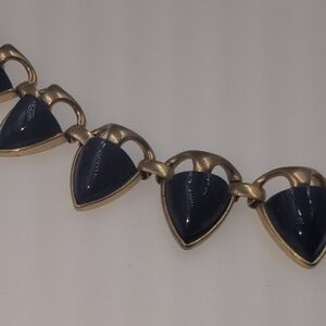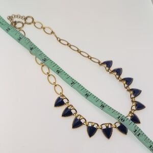 This striking Stella & Dot necklace showcases a modern geometric design with deep blue triangular elements set in a gold-toned frame. The bold contrast between the blue and gold creates an eye-catching statement piece perfect for any occasion.