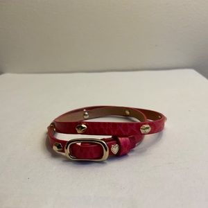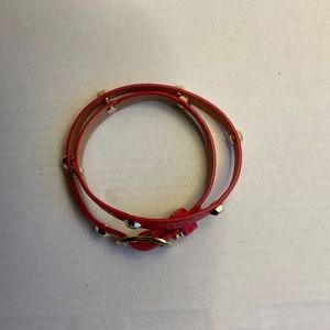 Double wrap snake embossed red leather bracelet features custom molded gold studded accents. Adjustable to fit most wrists. Gently pre- loved condition.