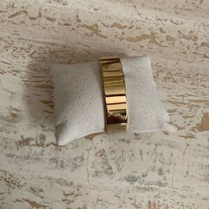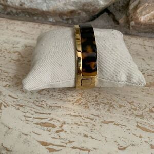 Tortoise with gold accent on the front and gold on the back. This cuff bracelet has a hinge closure and a little clasp that you push down onto open. Some minor signs of square on the cold side I tried to take as good photograph as I could of it.
