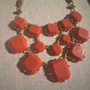 This is a stylish Stella & Dot necklace featuring a bold bib design in orange and gold. Made of acrylic beads, the necklace is adjustable for a comfortable fit. Perfect for adding a pop of color and flair to any outfit.