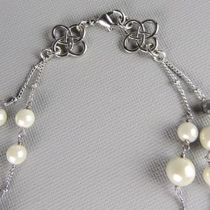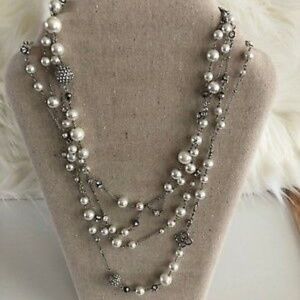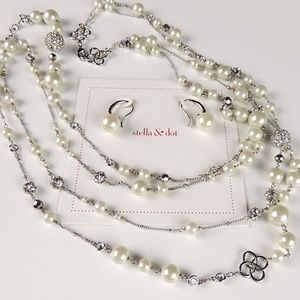A gorgeous long retired Stella & Dot ‘Madeline Pearl’ necklace. The necklace features glass pearls, faceted hematite beads, pave balls and channel set CZ stones along with alternating rhodium plated clovers on double chain with S&D sig clover. Lobster clasp closure on necklace. Can be worn long or doubled up as seen on the model. Never even worn! Stored with love. Excellent condition. Feel free to ask any questions or make me an offer. Open:))
