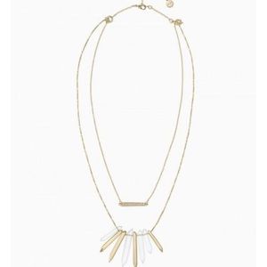 A cluster of shiny gold and semi precious clear crackled quartz fragments are suspended on one chain, while a shorter chain showcases a pavé bar that reverses from sparkle to solid gold.