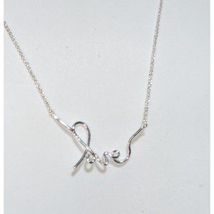 Bright minimalist silver love necklace by Stella & Dot. It's on a bright silver tone chain with a lobster clasp closure, and a Stella & Dot hang tag. It has a small wiry pendant that's about one and 1/4 inches. It spells out the word "love" in lowercase cursive letters. Perfect for Valentine's Day!