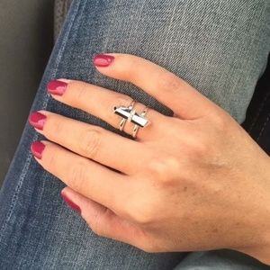 Stunning shiny silver plated prism of brass with pave stones. Adjustable band fits small-medium size. Matches anything beautifully! But I have many of the S&D Silver Rebel / Renegade Collection in my closet! Bundle & save!