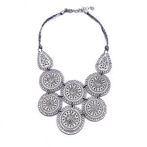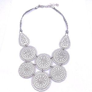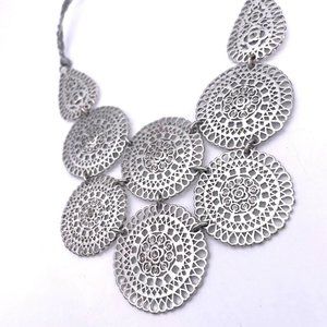 Elegant silver necklace with intricate circular designs. Perfect for adding a touch of sophistication.