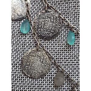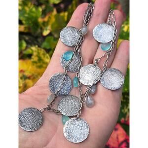 This is a stunning vintage sterling silver Greek/Roman/Byzantine (not sure which one) double sided coin and aqua blue chalcedony and labradorite faceted teardrop bead two chain or double strand necklace. This necklace features a hook clasp.