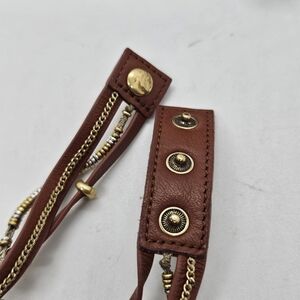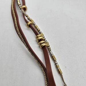 Brown faux leather wrap bracelet with snap closure. Has multiple strands, with primarily gold tone metallic chain and bead detail. Also has some silver tone beading. In good used condition with no known flaws. Can snap at lengths of approximately 13.5", 14.25", or 14.75"