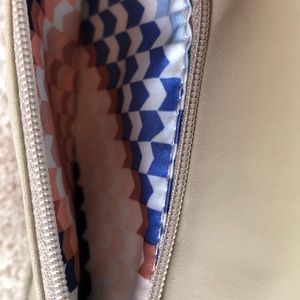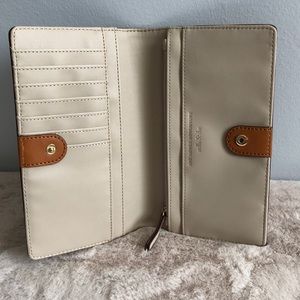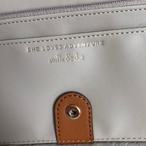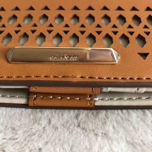 Stella & Dot brown leather wallet and/or clutch. Beautiful cut out design on the front. Cute blue, white, blush and brown design in every pocket and slot. Excellent condition! Never used!