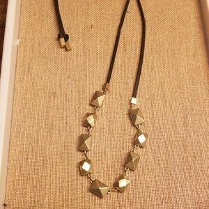 38 1/2 inch adjustable leather necklace. Can be worn as a long pendant, choker, bracelet or headband. Can be rhinestone or brushed gold side-up. So many options!! Excellent used condition