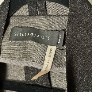 This Stella & Jamie blazer features a striking asymmetrical design with a waterfall front, crafted in sleek black for a modern edge. The open front style and long sleeves create a contemporary silhouette, perfect for adding a touch of sophistication to any outfit.