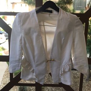 This adorable jacket has asymmetrical sleeves, ruffles along the sides, and a cool chain button closure. The sleeves hit right below the elbow.