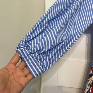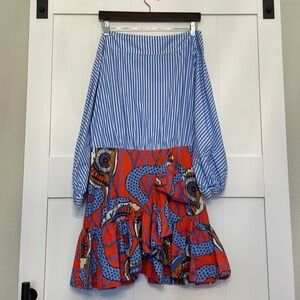 Blue and red printed cotton (100% Cotton). Hourglass. Short sleeves. Off the shoulder neckline. Zipper closure. 35" from shoulder to hemline. Imported.