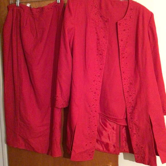 Three pieces red women suit (jacket, top and skirt)