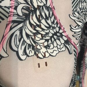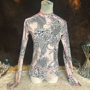 Excellent condition top with a mock turtleneck. This active top is great for so many uses. This measures 15.5 inches to pit and is 23 inches long. There are air holes that go halfway down the back from the top of the neck. The base color isclose to tan, but with a dusty rose hue to it.