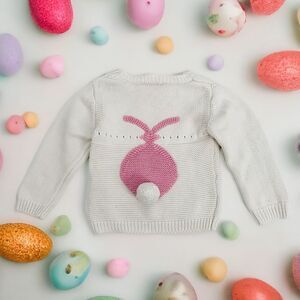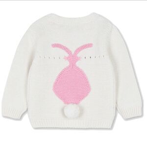 Stella McMartney kids baby toddler organic cotton & merino wool bunny sweater. This super soft sweater is perfect for Easter! Pink bunny in back, button collar, ribbed cuffs and hem.