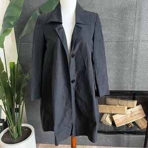 Stella McCartney Black Button Front Jacket. Gorgeous details with stitching, darts, subtle pleating give this a nice balance between minimalist and feminine. Pockets. Made in Italy. Size 38, which translates loosely to a Small. Approximate measurements (in pics): shoulder to shoulder (back) 14”, length 29”, PTP 17”. Preloved with one call outs: fabric contents tag was clipped.