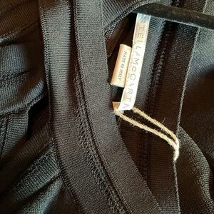 This Stella McCartney jumpsuit features a sophisticated cross-halter neckline and wide-leg palazzo pants, creating a flattering silhouette perfect for upscale occasions. The rich black color and sleek fabric add a touch of timeless elegance to this full-length design.