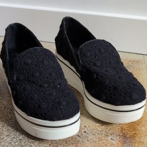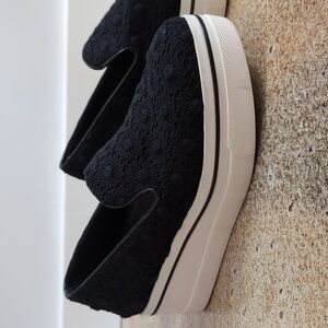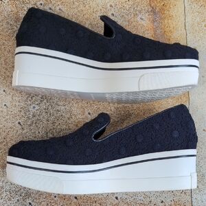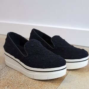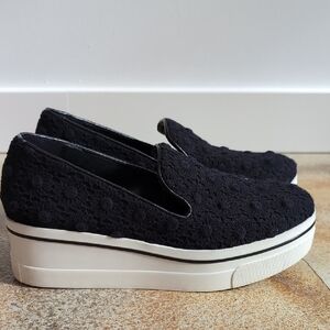 Step up your style with these Stella McCartney platform shoes, featuring a sleek black upper floral fabric crochet and contrasting white sole. The slip-on design ensures easy wear, while the thick sole adds height and comfort. Perfect for making a statement with a modern twist. Size EU 38 which is approximately US women's 7.5.