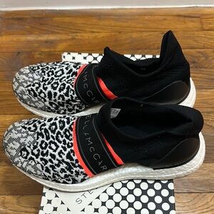 Step out in style with Adidas x Stella McCartney's black and white sneakers, featuring a striking leopard print. These slip-on sneakers combine fashion-forward design with comfort, making them perfect for working out or casual outings.