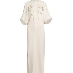 Stella McCartney’s maxi dress is designed with broderie anglaise flower cut outs at the chest. A round neck, three-quarter-length sleeves and a side slit completes this relaxed style.