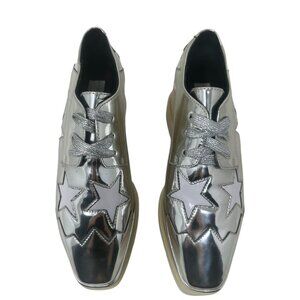 Stella McCartney Elyse Metallic Mirrored Silver White Star Patches Square Toe Lace Up Platforms Size 36, US 6, Vegan, Boho, Y2K