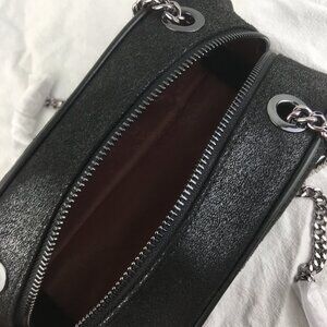 Our coveted and iconic Falabella is revisited in a new bowling bag silhouette for Summer 2025. The immediately recognizable glossy grained Shaggy Deer fabric is punctuated with a glinting diamond-cut chain hand-woven through eyelets. This playful, vegan shoulder bag is designed for the ultimate day-to-night appeal. Color: Black Comfortably fits all phones alongside small daily essentials Matte vegan Shaggy Deer fabric with semi-gloss grain Signature ruthenium recycled brass and aluminum diamond-cut chain Two shoulder straps One main compartment Zipper closure Engraved ruthenium logo medallion Recycled polyester monogram lining Handcrafted in Italy Care: Spot clean only with soft damp cloth. Composition: 100% Polyester Fit: Fits all phones, wallets and small daily essentials. Size: 10.2 x 4.3 x 3.9 in Strap length: 8.2 in Weighs approximately 14.8 oz