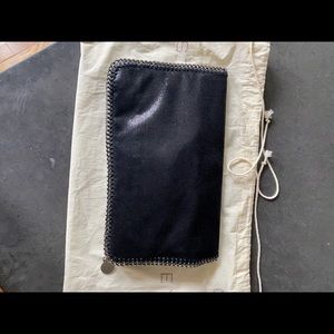 Black vegan suede with silver tone hardware. Chain link and whipstitch accents. Logo jacquard lining and single interior pocket. Snap closure front. Includes dust bag. Measurements: 7.5” height. 12” width 25”depth. Excellent condition.