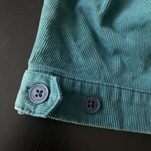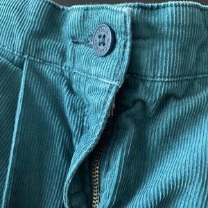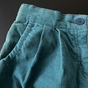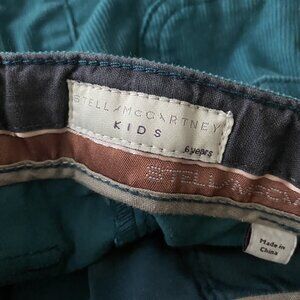 Stella McCartney Kids teal green corduroy mini skirt. Features pleats, front zip and button closure, side slash pockets, adjustable waist, and back flap pockets. Good condition for some fading. No stains or tears.