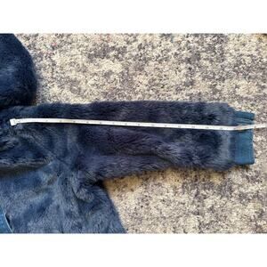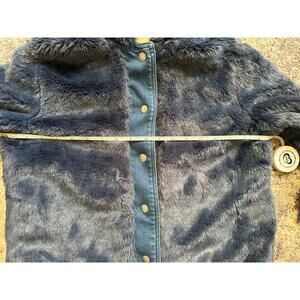 Adorable and stylish Stella McCartney Kids navy faux fur hooded jacket featuring a unique denim front placket and cuffs. This cozy mixed-material design blends plush faux fur with classic denim snap-button trim, giving it a cool, layered look without the bulk. Fully lined for comfort and warmth. A standout, modern piece with Stella’s signature playful, eco-friendly style.