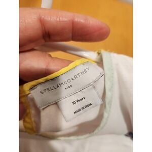 Stella McCartney Kids girls' dress in size 10 Years. Features bold watercolor-style paint print on fluttery puff sleeves and around the hem. Made from lightweight 100% cotton, this dress has a soft lining, pastel trim at the collar, and back keyhole closure. Eye-catching and artistic, this dress is perfect for summer events or creative photoshoots. Pre-owned with noted some mild discoloration on the front panel (see photos, it doesnt look obvious in picture but there some light yellowish ). Still has wearable life for play or resale. Made in India. Approx. PTP: 15", Length: 27".