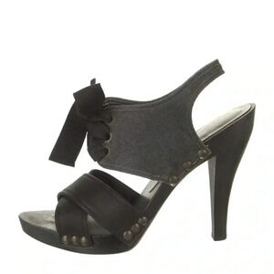 In great condition, these chic heels feature a unique fabric tie that elegantly bows in front , adding a touch of femininity to any outfit. The eye-catching hardware on the side of the heel adds a stylish flair, making these shoes perfect for both day and night wear.