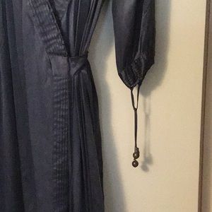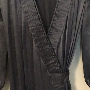 Elegant navy blue dress with long sleeves. Features a deep V-neck and wrap style. Perfect for any occasion.