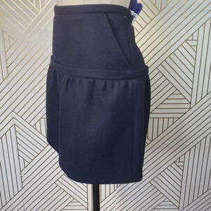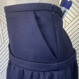 Stella McCartney Navy Blue Wool Mini Skirt. Solid navy blue featuring a dropped waist. Pockets on hips. A-line shape. Hidden zip at back.