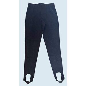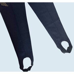 Great pair of Stella McCartney glam stirrup pants. Navy blue with black stirrups. Gold ruffle detail and design with zippers. Zip / hook closure. Made in Italy. Elastic stirrup. 96% wool / 2% polyester / 2% elastane. Size small (38). Pre-owned and gently worn in really nice condition!