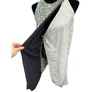resortwear, party dress, cocktail look, lightweight silk, artistic print, statement dress, designer drape, modern abstract, gallery outfit, wrap-effect, luxury vacation, sleeveless, green white black, breathable fabric