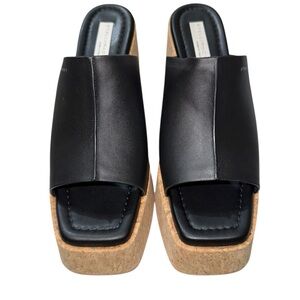 Elevate your style with these modern Stella McCartney Skyla Alter Sporty Mules, crafted in Italy with the brand’s signature commitment to sustainable luxury. Featuring a sleek black vegan leather upper and a chunky cork block heel, these mules combine comfort with bold, architectural design. The square toe silhouette adds a contemporary touch, while the platform heel offers both height and stability.