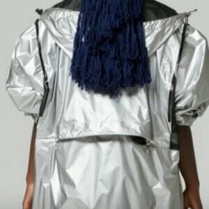 Easily incorporate the lightweight jacket into your everyday wardrobe, thanks to its chic oversized silhouette and shiny finish. bright windbreaker Hiking outdoor cold weather trail walking Sporty metallic silver metallic oversized coats sporty, trendy, urban, edgy,gorpcore, activewear, utility, shimmery, sparkly, shiny, iridescent,
