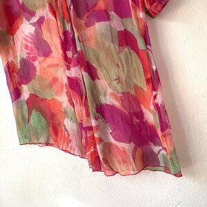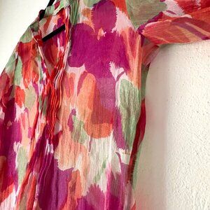Sheer Vibrant Floral Print. Asymmetrical Hem. Long or 3/4 sleeves with buttom closure. Pleated front neckline. Not sure what year this is from