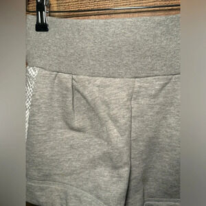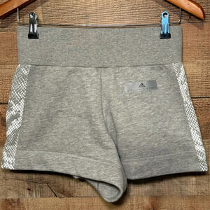 Adidas by Stella McCartney gray fleece athletic shorts with white snakeskin print down the sides. Women's size XS. Gently used excellent condition. Pull on style with ribbed waistband and two side pockets. Logo on rear.