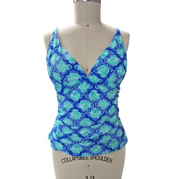 Stella Parker Collection 2 pc Tankini Blue/Green Shell Pattern Sz L, like new, no flaws. Has padded cups, no removable pads. Sides of the bottom can be adjusted.