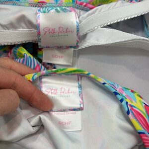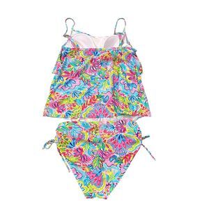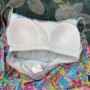 Stella Parker Tankini tank top, tie bottoms Swim Set Womens Small Multicolor Floral Tiered Layered 2Pc matching full set island pink blue green floral ruched tie sides