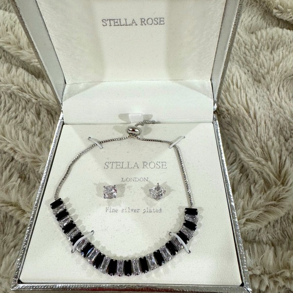 Elevate your look with this elegant Stella Rose jewelry set, featuring a fine silver-plated adjustable bracelet with alternating black and clear baguette stones and matching cubic zirconia stud earrings. Comes in original box — perfect for gifting or treating yourself!