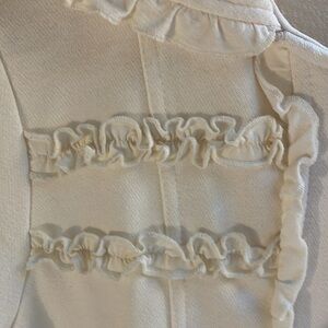 Stella Star Small Cream Hooded Ruffle Long Sweater Jacket with Large Wood Buttons. This is fitted at the waist. Beautiful piece to dress up or down. Pair with brown riding boots and jeans or black leggings. This is a staple for the colder months! Preloved condition.