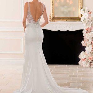Beaded banded straps create a V-neckline and V-back with a totally sheer bodice, covered with a lace overlay. The lace and crepe of this dress create a relaxed fit-and-flare silhouette that hugs the bride's body in all the right places.